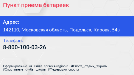 Пункт приема батареек по адресу 142110, Московская область, Подольск, Кирова, 54в в дальнейшем Организация, размещена в следующих категориях:
