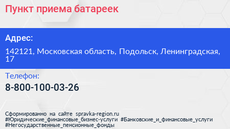 Пункт приема батареек по адресу 142121, Московская область, Подольск, Ленинградская, 17 в дальнейшем Организация, размещена в следующих категориях:
