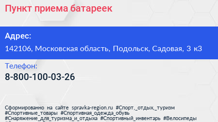 Пункт приема батареек по адресу 142106, Московская область, Подольск, Садовая, 3 к3 в дальнейшем Организация, размещена в следующих категориях: