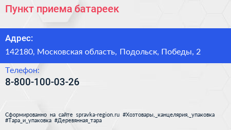 Пункт приема батареек по адресу 142180, Московская область, Подольск, Победы, 2 в дальнейшем Организация, размещена в следующих категориях: