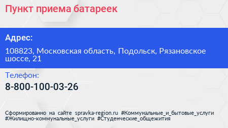 Пункт приема батареек по адресу 108823, Московская область, Подольск, Рязановское шоссе, 21 в дальнейшем Организация, размещена в следующих категориях: