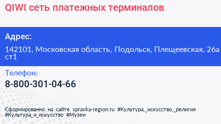 QIWI, сеть платежных терминалов по адресу 142101, Московская область, Подольск, Плещеевская, 26а ст1 в дальнейшем Организация, размещена в следующих категориях: