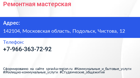 Ремонтная мастерская по адресу 142104, Московская область, Подольск, Чистова, 12 в дальнейшем Организация, размещена в следующих категориях: