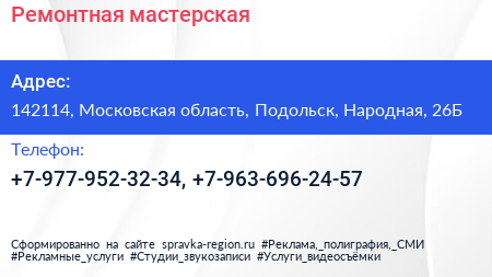 Ремонтная мастерская по адресу 142114, Московская область, Подольск, Народная, 26Б в дальнейшем Организация, размещена в следующих категориях: