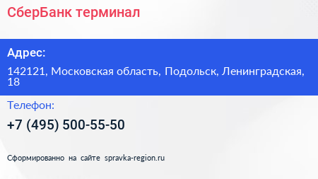 СберБанк, терминал по адресу 142121, Московская область, Подольск, Ленинградская, 18 в дальнейшем Организация, размещена в следующих категориях: