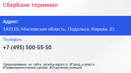 СберБанк, терминал по адресу 142110, Московская область, Подольск, Кирова, 21 в дальнейшем Организация, размещена в следующих категориях: