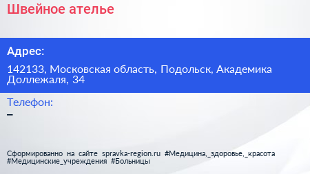 Швейное ателье по адресу 142133, Московская область, Подольск, Академика Доллежаля, 34 в дальнейшем Организация, размещена в следующих категориях: