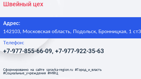 Швейный цех по адресу 142103, Московская область, Подольск, Бронницкая, 1 ст3 в дальнейшем Организация, размещена в следующих категориях: