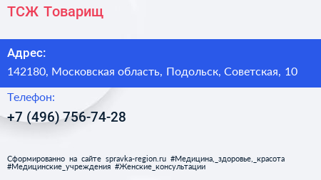 ТСЖ Товарищ по адресу 142180, Московская область, Подольск, Советская, 10 в дальнейшем Организация, размещена в следующих категориях: