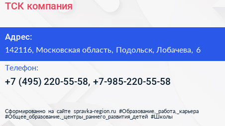 Для связи с организацией воспользуйтесь номером телефона: +7 (495) 220-55-58, +7-985-220-55-58. Ежедневно с 09:00 до 21:00, вы можете обратиться в эту организацию.