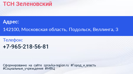 ТСН Зеленовский по адресу 142100, Московская область, Подольск, Веллинга, 3 в дальнейшем Организация, размещена в следующих категориях: