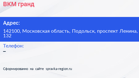 ВКМ-гранд по адресу 142100, Московская область, Подольск, проспект Ленина, 132 в дальнейшем Организация, размещена в следующих категориях: