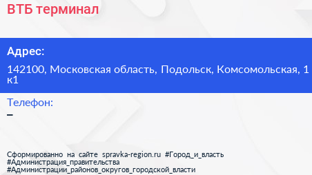 ВТБ, терминал по адресу 142100, Московская область, Подольск, Комсомольская, 1 к1 в дальнейшем Организация, размещена в следующих категориях: