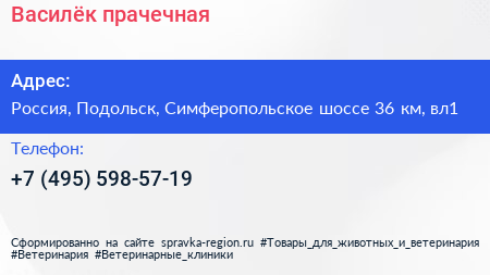 Василёк, прачечная по адресу Строительный рынок "Покров", Симферопольское шоссе (дублёр), Сельхозтехника, городской округ Подольск, Московская область, Центральный федеральный округ, 142116, Россия в дальнейшем Организация, размещена в следующих категориях:
