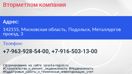 Вторметлом, компания по адресу 142155, Московская область, Подольск, Металлургов проезд, 3 в дальнейшем Организация, размещена в следующих категориях: