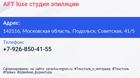 AFT luxe, студия эпиляции по адресу 142116, Московская область, Подольск, Советская, 41/5 в дальнейшем Организация, размещена в следующих категориях: