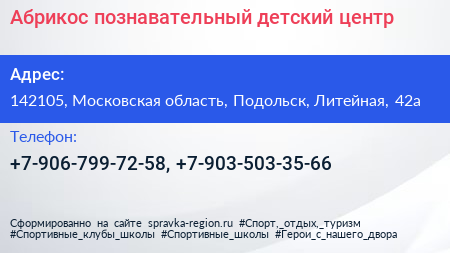 Абрикос, познавательный детский центр по адресу 142105, Московская область, Подольск, Литейная, 42а в дальнейшем Организация, размещена в следующих категориях: