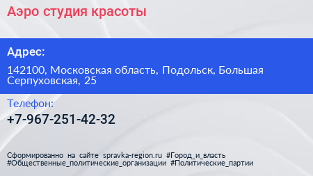 Аэро, студия красоты по адресу 142100, Московская область, Подольск, Большая Серпуховская, 25 в дальнейшем Организация, размещена в следующих категориях: