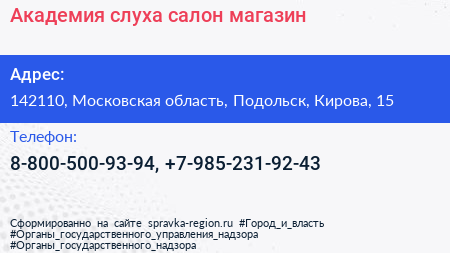 Академия слуха, салон-магазин по адресу 142110, Московская область, Подольск, Кирова, 15 в дальнейшем Организация, размещена в следующих категориях: