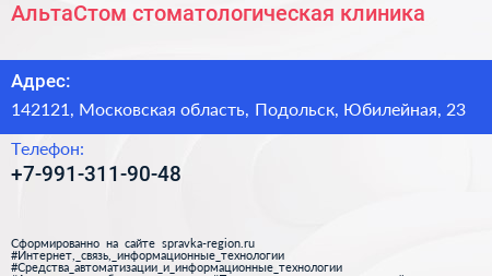 АльтаСтом, стоматологическая клиника по адресу 142121, Московская область, Подольск, Юбилейная, 23 в дальнейшем Организация, размещена в следующих категориях: