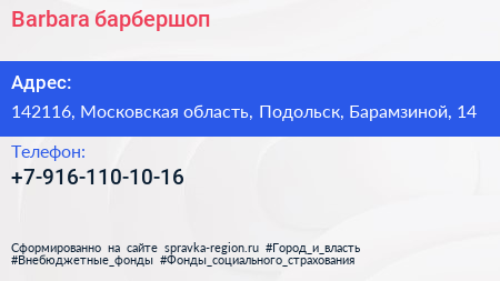 Barbara, барбершоп по адресу 142116, Московская область, Подольск, Барамзиной, 14 в дальнейшем Организация, размещена в следующих категориях: