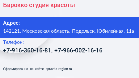 Барокко, студия красоты по адресу 142121, Московская область, Подольск, Юбилейная, 11а в дальнейшем Организация, размещена в следующих категориях: