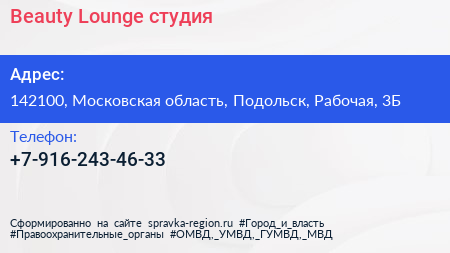 Beauty Lounge, студия по адресу 142100, Московская область, Подольск, Рабочая, 3Б в дальнейшем Организация, размещена в следующих категориях: