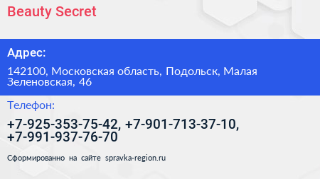 Beauty Secret по адресу 142100, Московская область, Подольск, Малая Зеленовская, 46 в дальнейшем Организация, размещена в следующих категориях: