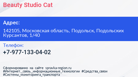 Beauty Studio Cat по адресу 142105, Московская область, Подольск, Подольских Курсантов, 1/40 в дальнейшем Организация, размещена в следующих категориях: