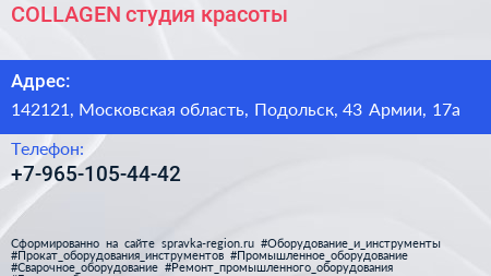 COLLAGEN, студия красоты по адресу 142121, Московская область, Подольск, 43 Армии, 17а в дальнейшем Организация, размещена в следующих категориях: