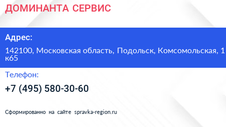 ДОМИНАНТА-СЕРВИС по адресу 142100, Московская область, Подольск, Комсомольская, 1 к65 в дальнейшем Организация, размещена в следующих категориях: