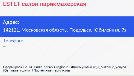 ESTET, салон-парикмахерская по адресу 142121, Московская область, Подольск, Юбилейная, 7а в дальнейшем Организация, размещена в следующих категориях:
