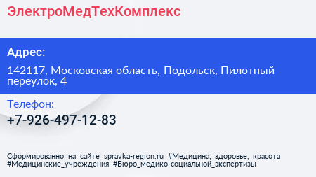 ЭлектроМедТехКомплекс по адресу 142117, Московская область, Подольск, Пилотный переулок, 4 в дальнейшем Организация, размещена в следующих категориях: