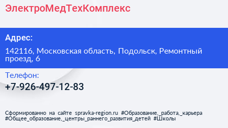 ЭлектроМедТехКомплекс по адресу 142116, Московская область, Подольск, Ремонтный проезд, 6 в дальнейшем Организация, размещена в следующих категориях:
