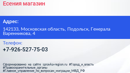 Есения, магазин по адресу 142133, Московская область, Подольск, Генерала Варенникова, 4 в дальнейшем Организация, размещена в следующих категориях: