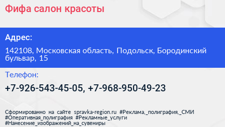 Фифа, салон красоты по адресу 142108, Московская область, Подольск, Бородинский бульвар, 15 в дальнейшем Организация, размещена в следующих категориях: