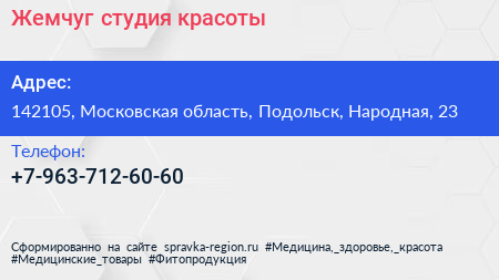 Жемчуг, студия красоты по адресу 142105, Московская область, Подольск, Народная, 23 в дальнейшем Организация, размещена в следующих категориях: