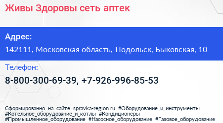 Живы-Здоровы, сеть аптек по адресу 142111, Московская область, Подольск, Быковская, 10 в дальнейшем Организация, размещена в следующих категориях: