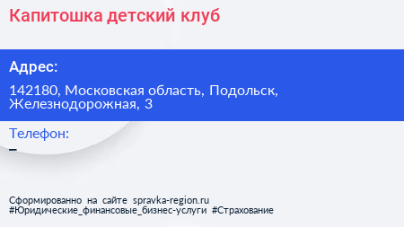 Капитошка, детский клуб по адресу 142180, Московская область, Подольск, Железнодорожная, 3 в дальнейшем Организация, размещена в следующих категориях: