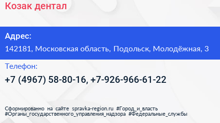 Козак-дентал по адресу 142181, Московская область, Подольск, Молодёжная, 3 в дальнейшем Организация, размещена в следующих категориях: