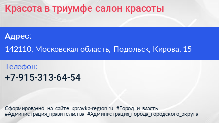 Красота в триумфе, салон красоты по адресу 142110, Московская область, Подольск, Кирова, 15 в дальнейшем Организация, размещена в следующих категориях: