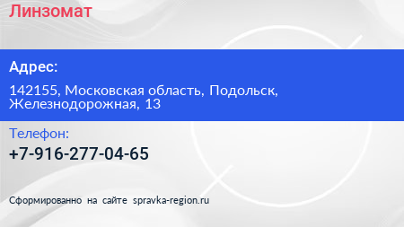 Линзомат по адресу 142155, Московская область, Подольск, Железнодорожная, 13 в дальнейшем Организация, размещена в следующих категориях: