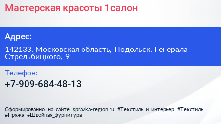 Мастерская красоты №1, салон по адресу 142133, Московская область, Подольск, Генерала Стрельбицкого, 9 в дальнейшем Организация, размещена в следующих категориях:
