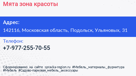 Мята, зона красоты по адресу 142116, Московская область, Подольск, Ульяновых, 31 в дальнейшем Организация, размещена в следующих категориях: