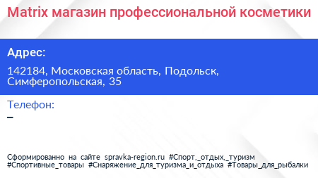 Matrix, магазин профессиональной косметики по адресу 142184, Московская область, Подольск, Симферопольская, 35 в дальнейшем Организация, размещена в следующих категориях: