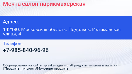 Мечта, салон-парикмахерская по адресу 142180, Московская область, Подольск, Ихтиманская улица, 4 в дальнейшем Организация, размещена в следующих категориях: