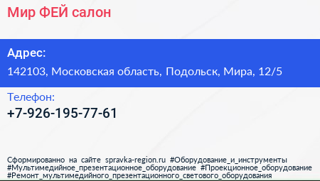 Мир ФЕЙ, салон по адресу 142103, Московская область, Подольск, Мира, 12/5 в дальнейшем Организация, размещена в следующих категориях: