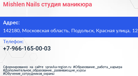 Mishlen Nails, студия маникюра по адресу 142180, Московская область, Подольск, Красная улица, 12а в дальнейшем Организация, размещена в следующих категориях: