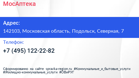 МосАптека по адресу 142103, Московская область, Подольск, Северная, 7 в дальнейшем Организация, размещена в следующих категориях:
