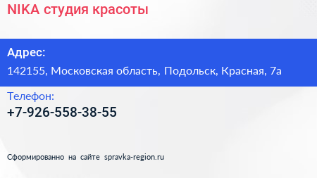 NIKА, студия красоты по адресу 142155, Московская область, Подольск, Красная, 7а в дальнейшем Организация, размещена в следующих категориях: